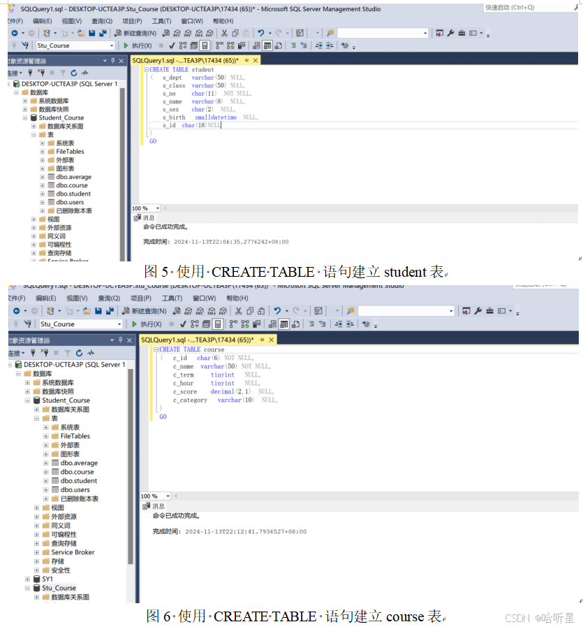 2.在查询窗口使用CREATE TABLE语句创建T_student表、T_course表、T_average表、T_user表,这些表的结构和内容分别与student表、course表、average表、user表相同(相关Transact-SQL命令书写语法格式见实验指导书第67页)