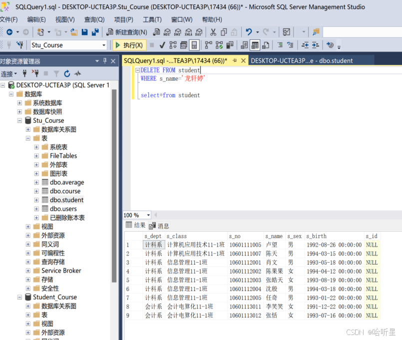 - 在查询窗口使用delete语句删除student表中“s_name”为“龙轩婷”的记录。
