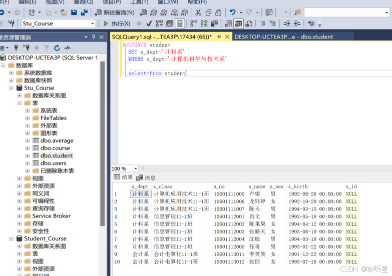 - 在查询窗口使用UPDATE语句修改student表的内容,把系别字段s_dept值为“计算机科学与技术系”改为“计科系”