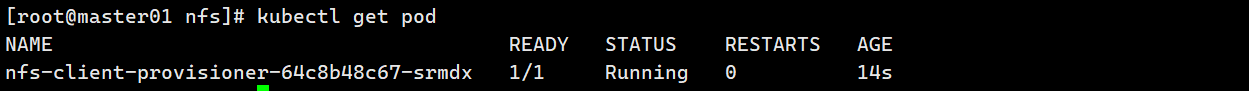 spec:replicas: 1selector:matchLabels:app: nfs-client-provisionerstrategy:type: Recreatetemplate:metadata:labels:app: nfs-client-provisionerspec:serviceAccountName: nfs-client-provisioner #指定Service Account账户containers:- name: nfs-client-provisionerimage: k8s.gcr.io/sig-storage/nfs-subdir-external-provisioner:v4.0.2imagePullPolicy: IfNotPresentvolumeMounts:- name: nfs-client-rootmountPath: /persistentvolumesenv:- name: PROVISIONER_NAMEvalue: nfs-storage #配置provisioner的Name,确保该名称与StorageClass资源中的provisioner名称保持一致- name: NFS_SERVERvalue: stor01 #配置绑定的nfs服务器- name: NFS_PATHvalue: /opt/k8s #配置绑定的nfs服务器目录volumes: #申明nfs数据卷- name: nfs-client-rootnfs:server: stor01path: /opt/k8skubectl get pod