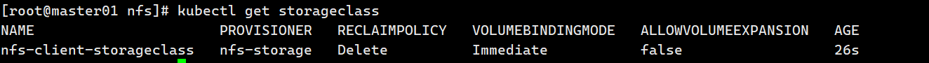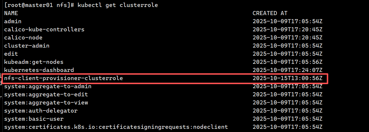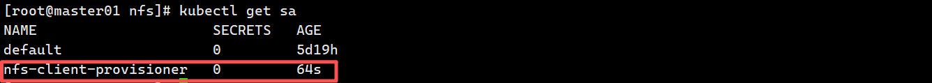 roleRef:kind: ClusterRolename: nfs-client-provisioner-clusterroleapiGroup: rbac.authorization.k8s.iokubectl apply -f nfs-client-rbac.yamlkubectl get sa #查看集群中ServiceAccount(服务账户)kubectl get clusterrole #查看集群级别的角色(ClusterRole)