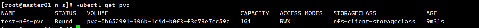 1) PVC 通过 StorageClass 自动申请到空间kubectl get pvc2) 查看 NFS 服务器上是否生成对应的目录,自动创建的 PV 会以 ${namespace}-${pvcName}-${pvName} 的目录格式放到 NFS 服务器上