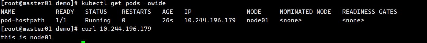 spec:containers:- name: myappimage: ikubernetes/myapp:v1#定义容器挂载内容volumeMounts:#使用的存储卷名称,如果跟下面volume字段name值相同,则表示使用volume的这个存储卷- name: html#挂载至容器中哪个目录mountPath: /usr/share/nginx/html#读写挂载方式,默认为读写模式falsereadOnly: false#volumes字段定义了paues容器关联的宿主机或分布式文件系统存储卷volumes:#存储卷名称- name: html#路径,为宿主机存储路径hostPath:#在宿主机上目录的路径path: /data/pod/volume1#定义类型,这表示如果宿主机没有此目录则会自动创建type: DirectoryOrCreatekubectl apply -f pod-hostpath.yaml