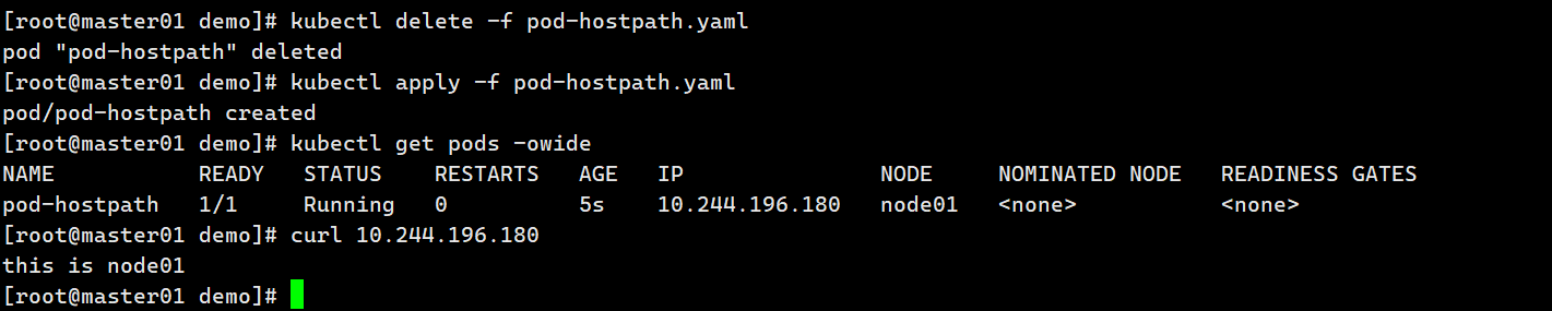 kubectl apply -f pod-hostpath.yaml Pod 删除重建后仍能访问相同内容,说明数据持久化。