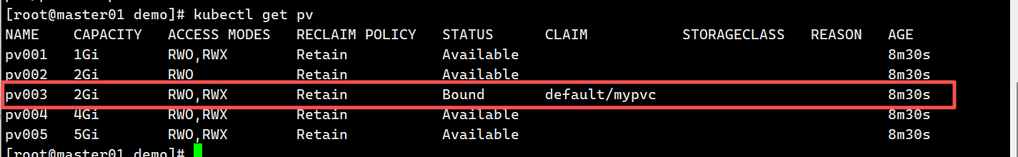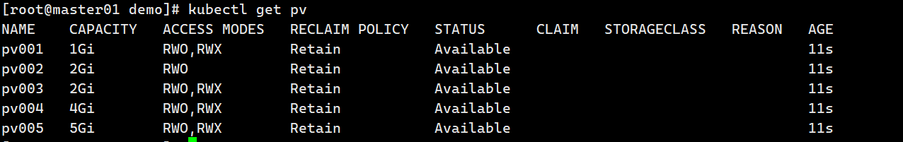 spec:nfs:path: /data/volumes/v5server: stor01accessModes: ["ReadWriteMany","ReadWriteOnce"]capacity:storage: 5Gikubectl apply -f pv-demo.yamlkubectl get pv