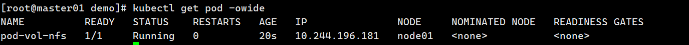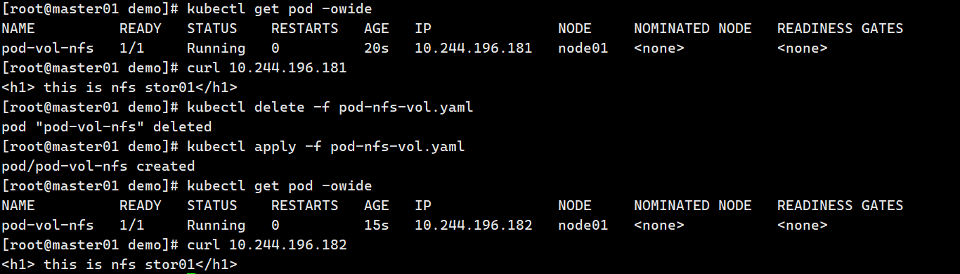 <h1> this is nfs stor01</h1>kubectl delete -f pod-nfs-vol.yaml #删除nfs相关pod,再重新创建,可以得到数据的持久化存储kubectl apply -f pod-nfs-vol.yaml