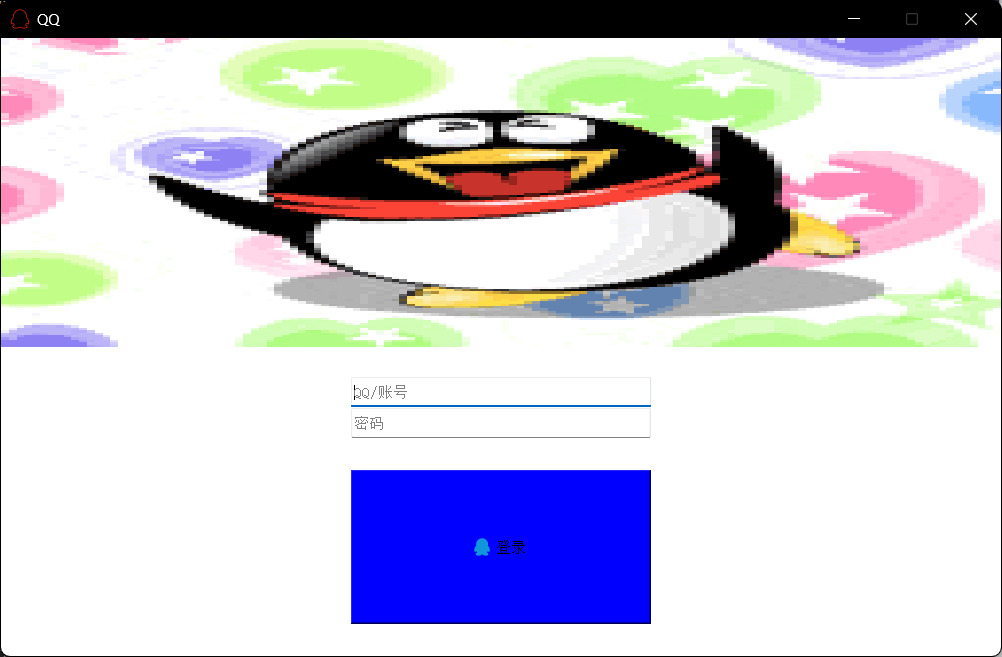 #include "mywidget.h" // 包含自定义窗口类MyWidget的头文件// MyWidget类的构造函数,parent为父窗口指针 MyWidget::MyWidget(QWidget *parent): QWidget(parent) // 初始化父类QWidget {this->setWindowTitle("QQ"); // 设置窗口标题为"QQ"// 设置窗口图标,图标路径为"D:\\Game\\icon\\qq.svg"this->setWindowIcon(QIcon("D:\\Game\\icon\\qq.svg"));this->setStyleSheet("background:white;"); // 设置窗口背景色为白色this->setFixedSize(QSize(1000,618)); // 设置窗口固定大小为1000x618像素// 获取屏幕的几何信息(尺寸和位置)QRect screen = QGuiApplication::primaryScreen()->geometry();// 将窗口移动到屏幕中央(计算方式:(屏幕宽度-窗口宽度)/2 为水平居中位置,垂直方向同理)this->move((screen.width()-this->width())/2, (screen.height()-this->height())/2);// 创建QMovie对象,加载GIF动画文件(路径为"D:\\Game\\GIf\\20251015195257.gif")QMovie *mv = new QMovie("D:\\Game\\GIf\\20251015195257.gif");// 创建标签lab1,作为GIF的显示容器,父窗口为当前窗口QLabel *lab1 = new QLabel("图片",this);lab1->setMovie(mv); // 为标签设置要显示的GIF动画mv->start(); // 开始播放GIF动画lab1->setScaledContents(true); // 设置标签内容(GIF)可缩放以适应标签大小lab1->resize(this->width(), this->height()/2); // 设置标签大小:宽度与窗口相同,高度为窗口的一半// 创建账号输入框edit1,父窗口为当前窗口QLineEdit *edit1 = new QLineEdit(this);edit1->setFixedSize(this->width()*0.3,this->height()*0.05); // 设置输入框大小:宽度为窗口30%,高度为窗口5%// 设置输入框位置:水平居中,垂直位置在窗口高度的55%处edit1->move((this->width()-edit1->width())/2,this->height()*0.55);edit1->setPlaceholderText("QQ/账号"); // 设置输入框占位提示文本为"QQ/账号"// 创建密码输入框edit2,父窗口为当前窗口QLineEdit *edit2 = new QLineEdit(this);edit2->setFixedSize(this->width()*0.3,this->height()*0.05); // 大小与账号输入框一致// 设置位置:水平居中,垂直位置在窗口高度的60%处(在账号框下方)edit2->move((this->width()-edit1->width())/2,this->height()*0.6);edit2->setEchoMode(QLineEdit::Password); // 设置为密码模式(输入内容显示为圆点/星号)edit2->setPlaceholderText("密码"); // 设置占位提示文本为"密码"// 创建登录按钮btn1,显示图标(路径"D:\\Game\\icon\\qq登录.svg")和文本"登录",父窗口为当前窗口QPushButton *btn1 = new QPushButton(QIcon("D:\\Game\\icon\\qq登录.svg"),"登录",this);btn1->setFixedSize(this->width()*0.3,this->height()*0.25); // 设置按钮大小:宽度30%窗口宽,高度25%窗口高// 设置按钮位置:水平居中,垂直位置在窗口高度的70%处(在密码框下方)btn1->move((this->width()-btn1->width())/2,this->height()*0.7);btn1->setStyleSheet("background:blue;"); // 设置按钮背景色为蓝色}// MyWidget类的析构函数(目前为空实现) MyWidget::~MyWidget() { }