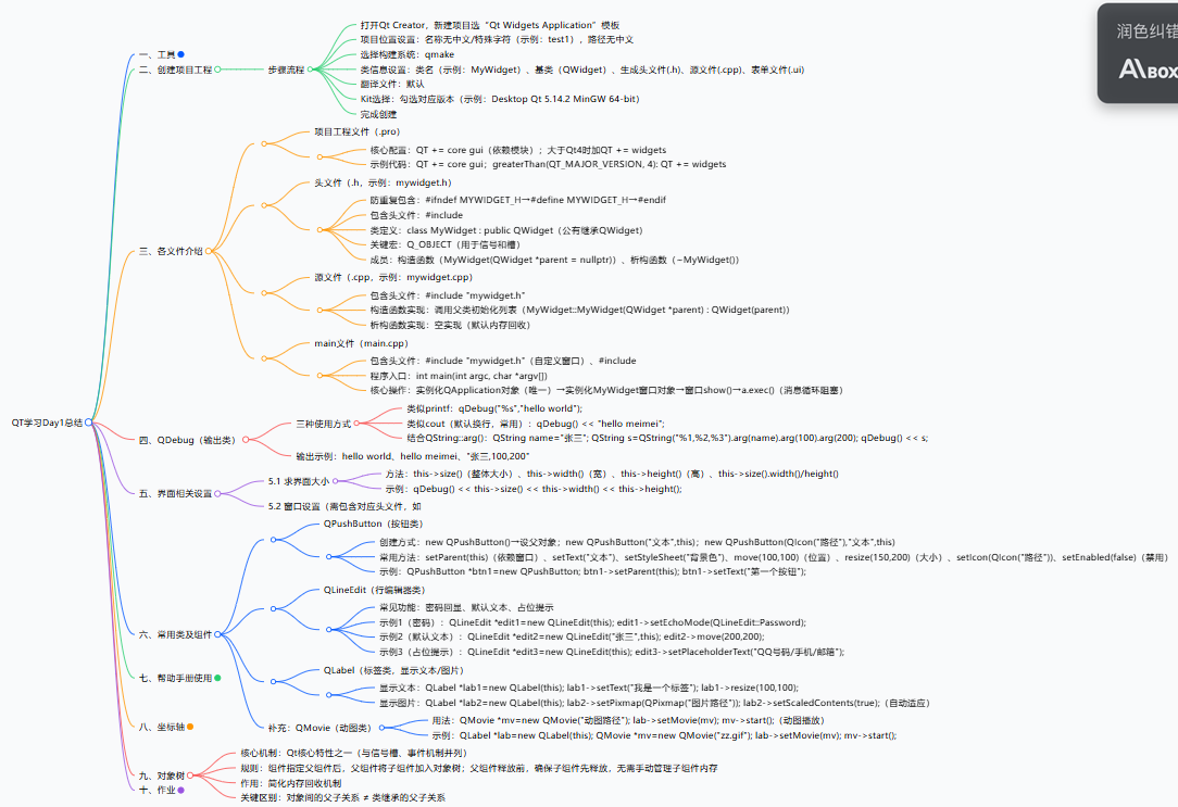 常用方法:setParent(this)(依赖窗口)、setText("文本")、setStyleSheet("背景色")、move(100,100)(位置)、resize(150,200)(大小)、setIcon(QIcon("路径"))、setEnabled(false)(禁用)