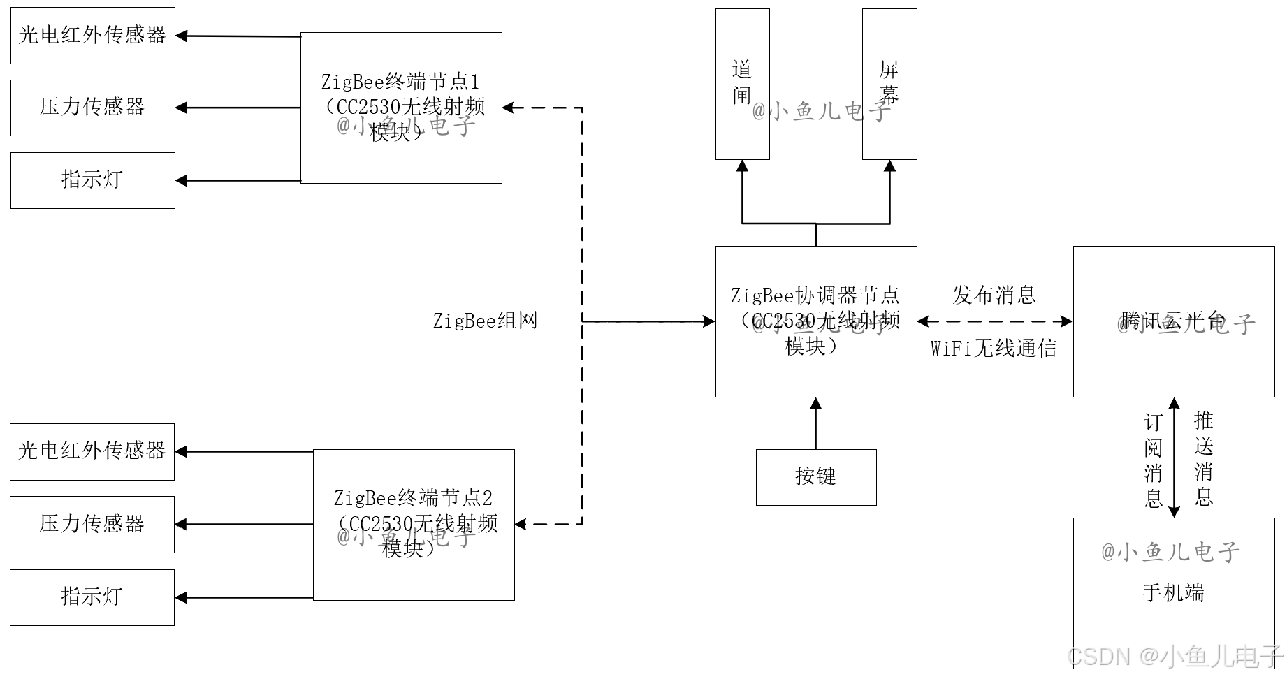 技术框架:ZigBee终端节点*2+ZigBee协调器节点+WiFi无线通信技术(MQTT协议)+腾讯云平台+微信小程序