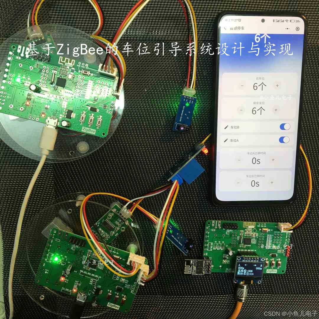 多个终端节点通过ZigBee 无线通信自组成网,实现车位状态数据的低功耗、分布式传输(ZigBee 适合短距离、多节点场景,能覆盖停车场内大量车位)。
