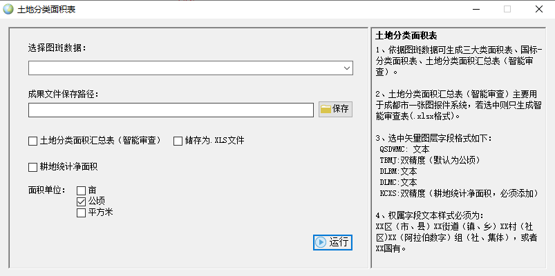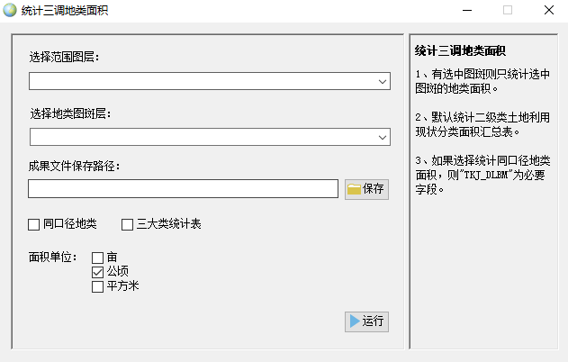 本次更新新增统计三调地类面积工具,该工具同样利用了Aspose.Cells库,无需用户安装Office程序,同样也是内置了统计表格模板(包含最新的1208后备耕地)。工具默认统计土地利用现状二级分类,支持统计同口径地类及土地利用三大类面积,支持自定义统计表的面积单位。