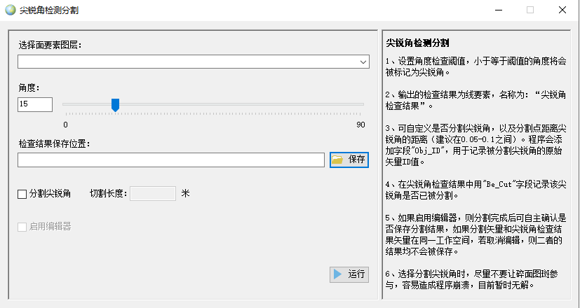 本次更新优化了程序的代码,增加了分割尖锐角失败的图斑ID值提示,并通过显式释放COM对象,解决了开启编辑器时因数据量过大,导致程序崩溃的问题(已通过10万+条数据测试)。但选择分割尖锐角时,尽量不要让碎面图斑参与,因几何问题,容易造成程序崩溃,目前暂时无解。