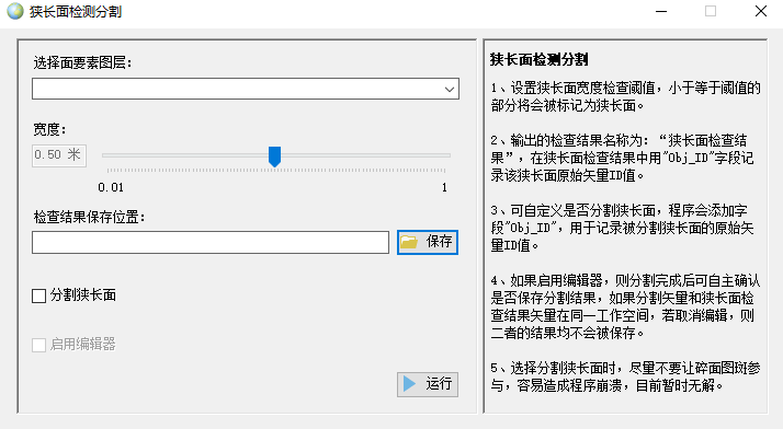 本次更新优化了程序的代码及狭长面的判断方法,大大提升了程序的运行效率,并通过显式释放COM对象,解决了开启编辑器时因数据量过大,导致程序崩溃的问题(已通过10万+条数据测试)。但选择分割狭长面时,也尽量不要让碎面图斑参与,因几何问题,容易造成程序崩溃,目前暂时无解。