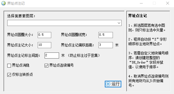 本次更新增加了“仅标注转折点”选项,选中此选项后除首尾界址点外,只会在范围线的转折点处生成界址点注记,可防止界址点标注过密。