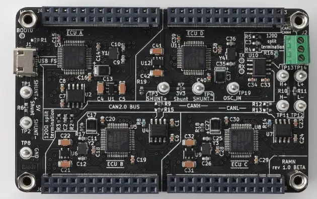 为解决上述问题,我们研发了 “抗干扰汽车微型网络(RAMN)”—— 一款针对物理测试优化的开源测试平台。它被集成在一块信用卡大小的印刷电路板(PCB)中,因此能够适配汽车测试设备以及硬件安全研究人员使用的设备。该平台主要采用车规级组件,可承受高达 150°C 的温度,能够在与真实电子控制单元相同的环境条件下运行。同时,其设计成本较低,研究人员可以购置多个测试平台,无需担心损坏或独占使用的问题。