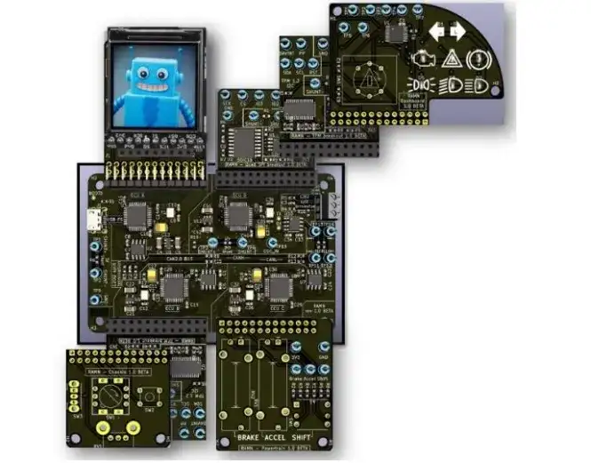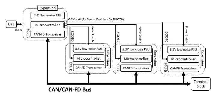 这些电子控制单元均连接到同一个 CAN/CAN-FD 总线。其中,网关电子控制单元还与 USB 端口相连,通过 “slcan” 协议或 socketCAN 驱动程序,可将其用作通用 CAN/CAN-FD 适配器。借助 STM32 内置的 DFU 引导加载程序,可通过 USB 对网关电子控制单元进行重新编程。此外,网关电子控制单元还能分别控制每个电子控制单元的电源模块。通过开启或关闭某个电子控制单元的电源,网关电子控制单元可利用 STM32 内置的 CAN 引导加载程序,通过 CAN 总线对其他电子控制单元进行编程。因此,所有电子控制单元均可通过 USB 独立进行重新编程。