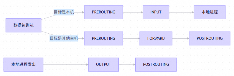转发流量 | PREROUTING → FORWARD → POSTROUTING |