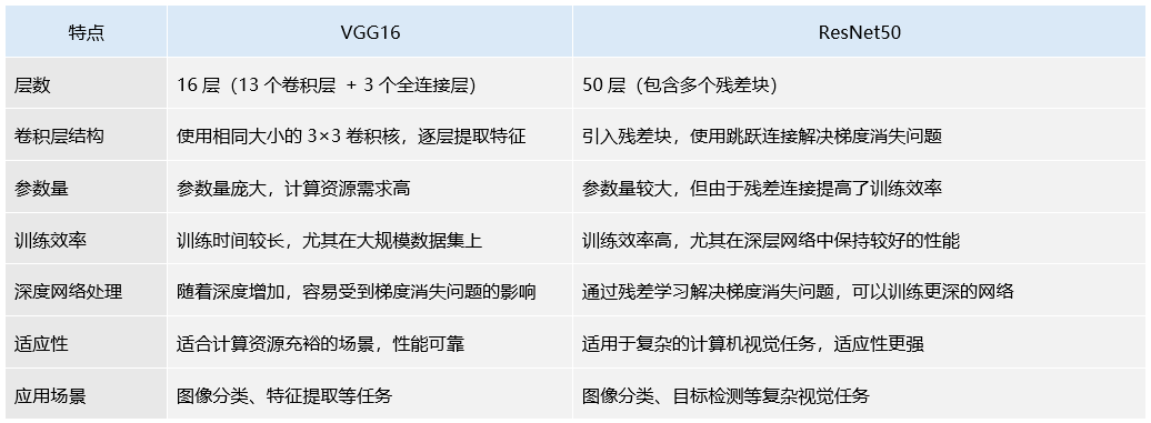 该表格对比了VGG16与ResNet50在网络层数、卷积层结构、参数量、训练效率、深度网络处理能力、适应性和应用场景等方面的主要差异,突出了ResNet50在处理深层网络时的优势,尤其在训练效率和梯度消失问题的解决上。