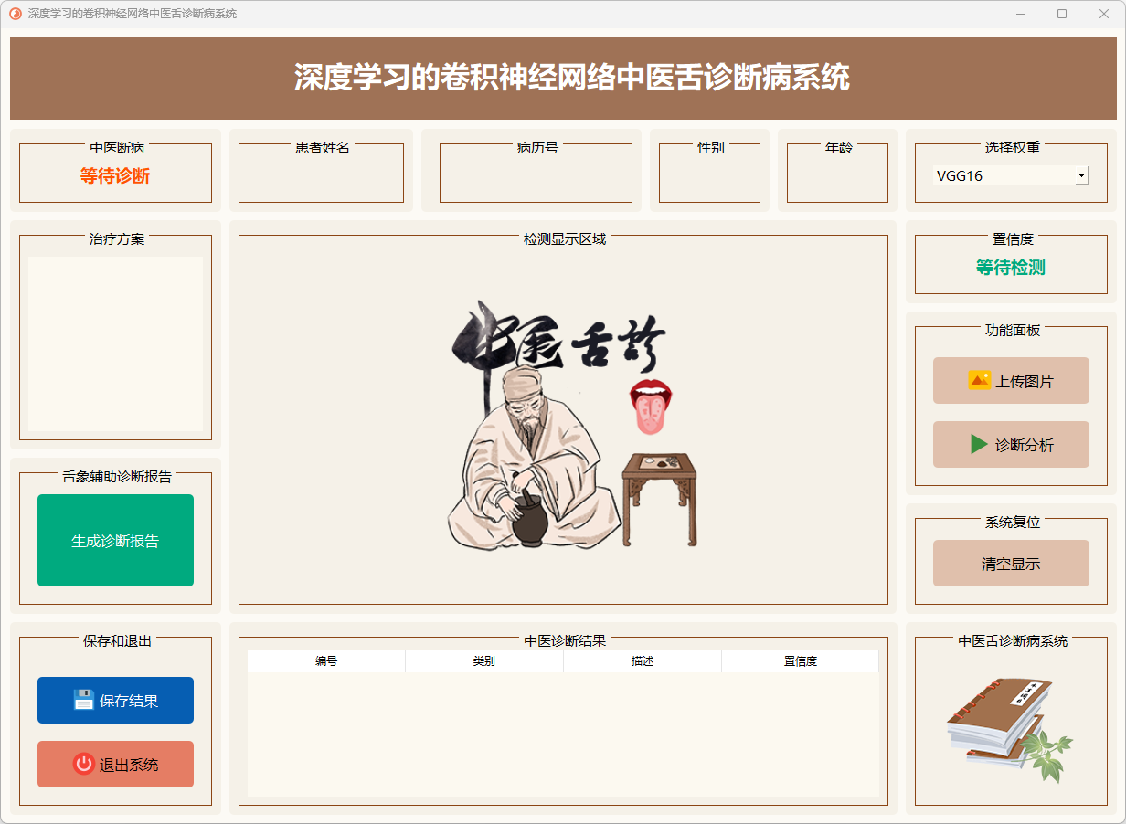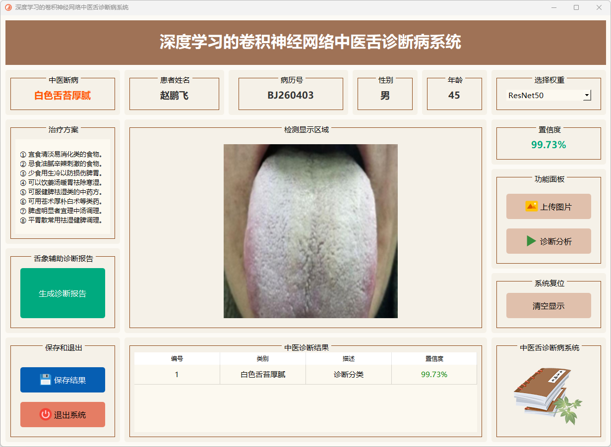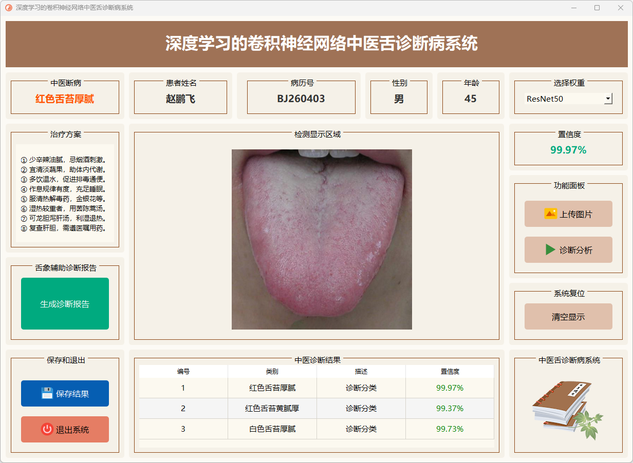 本系统基于深度学习的卷积神经网络(CNN)模型,旨在实现中医舌象图像的自动分析与疾病诊断。系统集成了多种深度学习模型(主要包括 ResNet50 与 VGG16),可对舌象图像进行特征提取、分类与诊断结果展示。通过对比不同模型的性能表现,本系统为中医舌诊的智能化、标准化研究提供了技术支撑。以下为主要功能界面的展示: