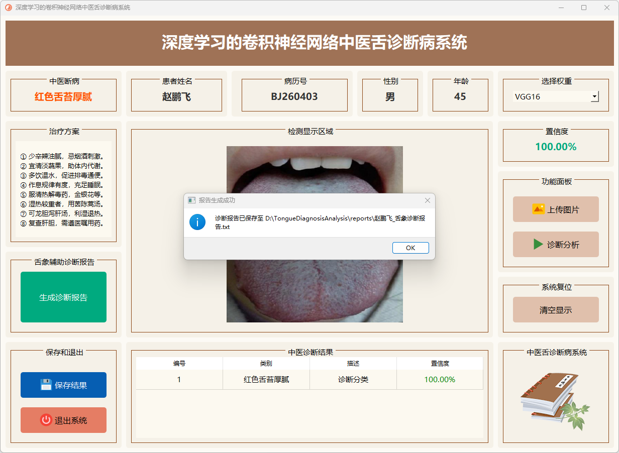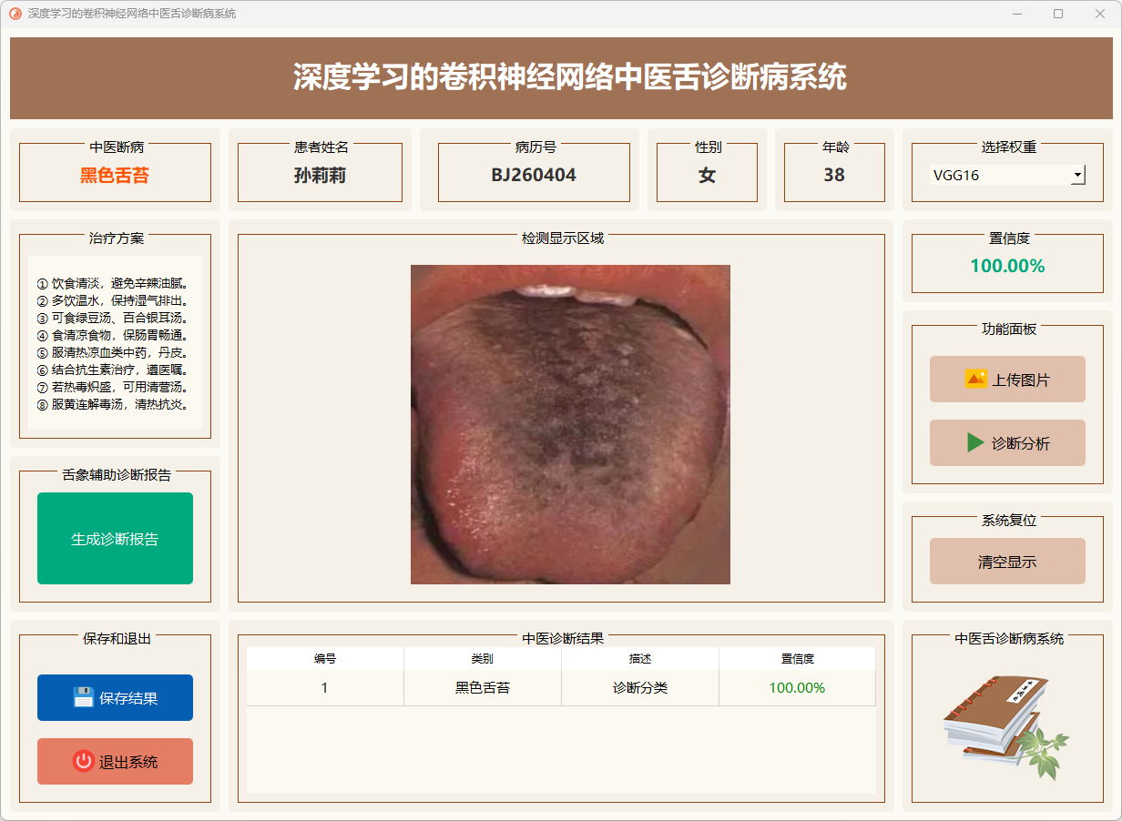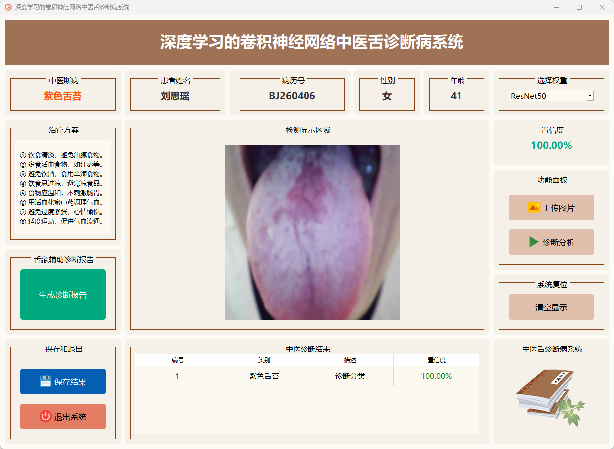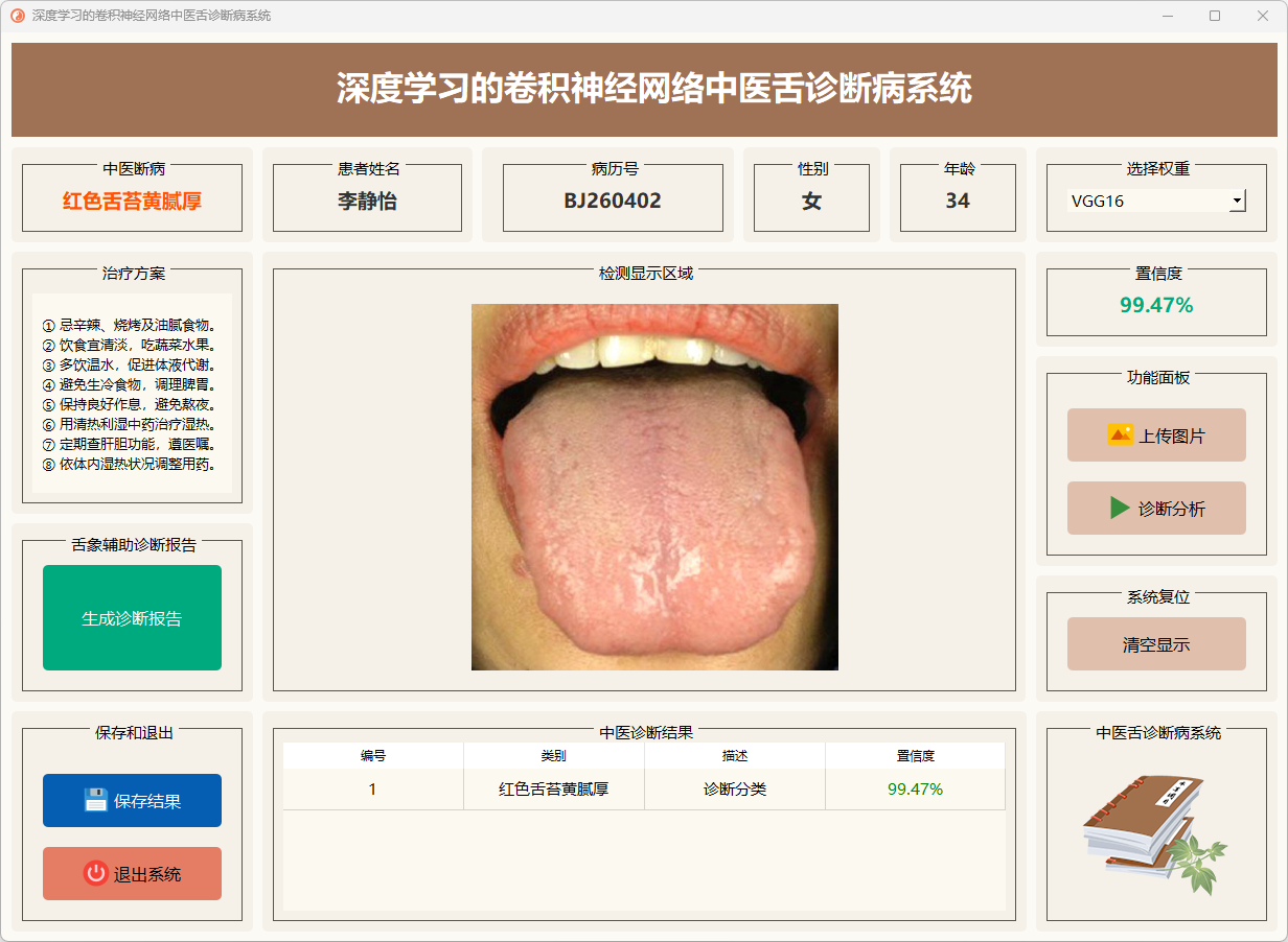 本系统基于深度学习的卷积神经网络(CNN)模型,旨在实现中医舌象图像的自动分析与疾病诊断。系统集成了多种深度学习模型(主要包括 ResNet50 与 VGG16),可对舌象图像进行特征提取、分类与诊断结果展示。通过对比不同模型的性能表现,本系统为中医舌诊的智能化、标准化研究提供了技术支撑。以下为主要功能界面的展示: