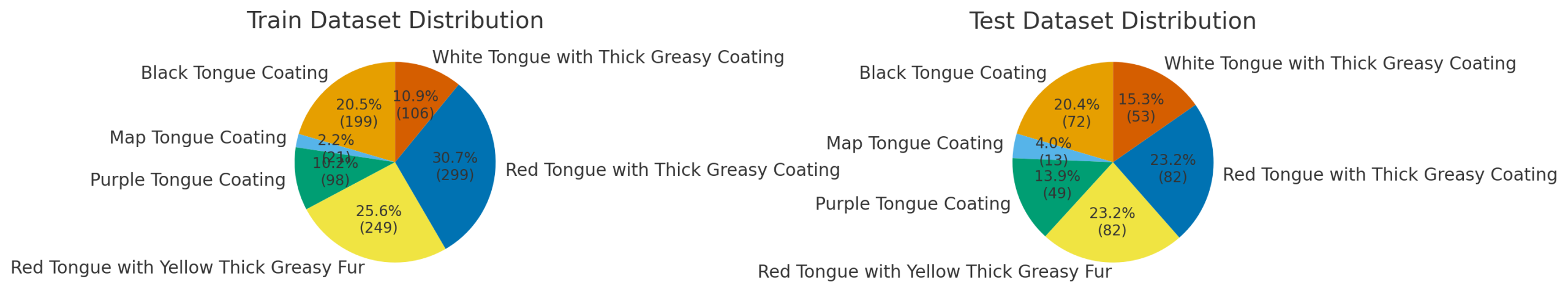 本研究在对原始舌苔图像数据进行清洗与筛选后,构建了一个包含6个舌苔类别的中医舌象数据集,分别为红色舌苔厚腻、白色舌苔厚腻、黑色舌苔、白霉舌苔、紫色舌苔和红色舌苔黄腻厚。该数据集的类别分布均衡,全面涵盖了中医临床中常见的不同舌苔类型,能够真实反映患者的舌象特征。数据集中每类舌苔图像均经过标准化处理与质量控制,确保了样本的代表性与清晰度。该数据集为后续基于深度学习模型(如VGG16、ResNet50)进行舌苔识别与病证分类提供了坚实的数据支撑,为中医舌诊的客观化与智能化研究奠定了基础。