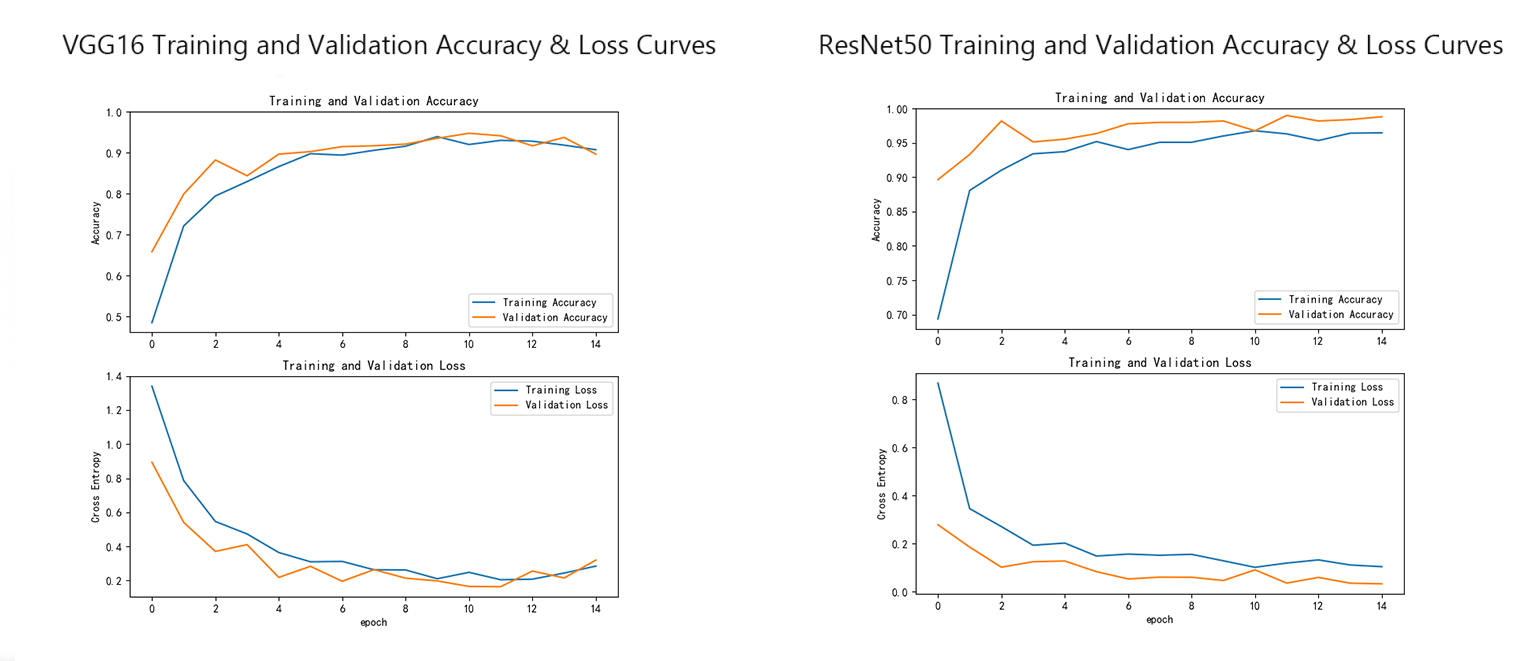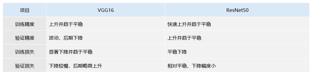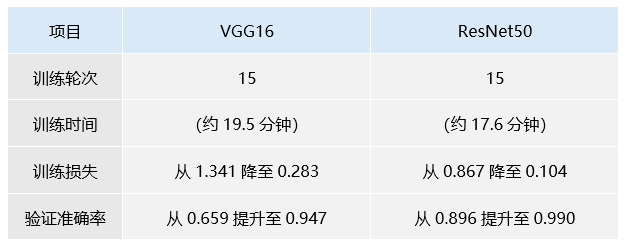 从这两张训练和验证的准确率与损失曲线图来看,VGG16 的准确率在前几个 epoch 迅速上升后趋于平稳,但验证准确率有所波动,且训练损失较为陡峭下降;而 ResNet50 则表现得更加稳定,验证准确率持续上升,并且训练损失下降平稳,展现了更强的泛化能力。
