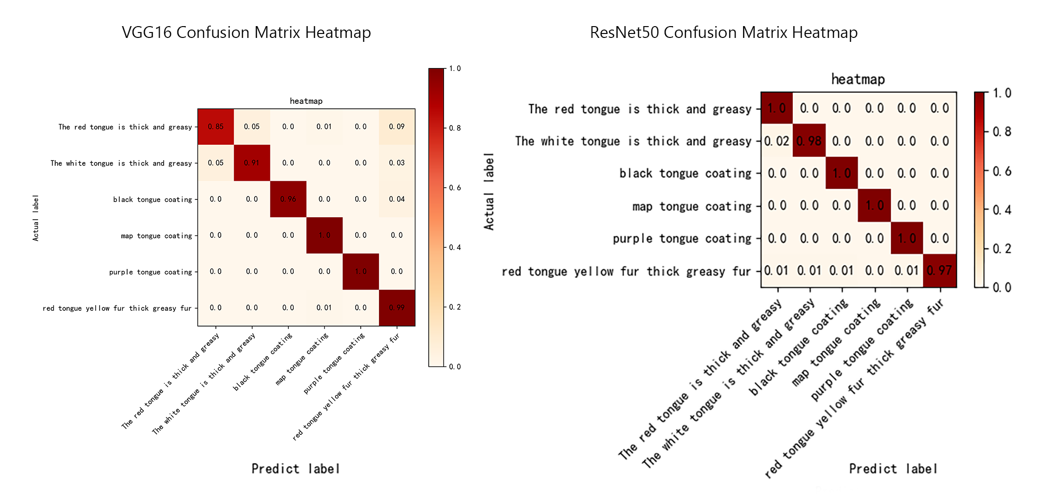 从这两张混淆矩阵热力图来看,VGG16 和 ResNet50 都在大多数类别上有着较高的预测准确率,尤其是“黑苔舌”和“地图舌”类别,几乎达到了100%的准确率。VGG16 在“红舌黄腻厚腻苔”类别上有较多的误分类(9%),而 ResNet50 在“红舌黄腻厚腻苔”类别的误分类更少,仅为1%,表现出更高的精度。