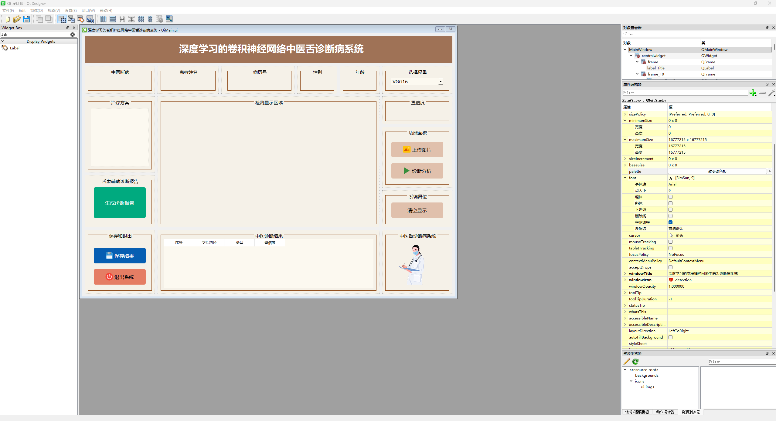 系统主界面集成了舌象图像上传、模型选择、实时分析及诊断结果展示等功能。用户可在界面中直观选择不同的卷积神经网络模型(如 VGG16 与 ResNet50),上传舌象图像后系统将自动进行特征识别与分类分析,并生成对应的诊断结果。界面支持对模型预测结果的可视化展示,方便科研人员与临床医生对比不同模型的诊断表现。