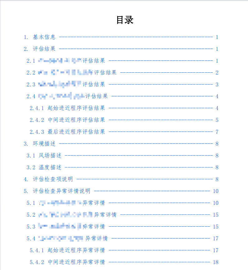 <body><div class="cover-page" ><div><div class="main-title">PBN飞行程序安全评估系统</div><div class="main-title">飞行计划验证评估报告</div></div><div class="footer"><div>验证用户:${currentUser}</div><div class="sub-title">报告时间:${time}</div></div></div><div class="toc-page" style="page-break-after: always;"><h1 style="text-align:center; font-family:SimSun; font-size:22pt;">目录</h1><ul id="toc-list" style="list-style-type:none; padding-left:0; font-family:FangSong; font-size:14pt;"></ul></div><div class="content-page"><h1 id="section-basic">1. 基本信息</h1><p>本次飞行计划安全评估的飞行计划名称为:${flightPlanName}。</p><p>涵盖飞行程序如下:</p><p>${basicDes}</p><p>本次评估过程共执行仿真${simCount}次,具体环境设置详见环境描述章节。</p><h1 id="section-result">2. 评估结果</h1>//......</div><script>document.addEventListener('DOMContentLoaded', async() => {// 1. 获取所有需要编入目录的标题const sections = [{ id: 'section-basic', title: '1. 基本信息' },{ id: 'section-result', title: '2. 评估结果' }];sections.push({ id: 'section-env', title: '3. 环境描述' },{ id: 'one-env', title: ' 3.1 风场描述' },{ id: 'two-env', title: ' 3.2 温度描述' },{ id: 'section-check', title: '4. 评估检查项说明' },{ id: 'section-detail', title: '5. 评估检查异常详情说明' });// 计算每部分起始页码(正文从第3页开始)let pageCounter = 3;const tocList = document.getElementById('toc-list');sections.forEach(section => {const element = document.getElementById(section.id);if (element) {const rect = element.getBoundingClientRect();const pageNum = Math.floor(rect.top / 1123) + pageCounter; // 1123为A4页高度const li = document.createElement('li');li.style.margin = '10px 0';li.innerHTML = `<a href="#${section.id}" style="color:#0066cc; text-decoration:none;">${section.title}<span style="float:right;">${pageNum}</span></a>`;tocList.appendChild(li);}});});</script>