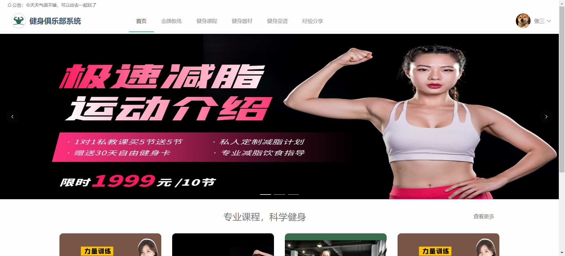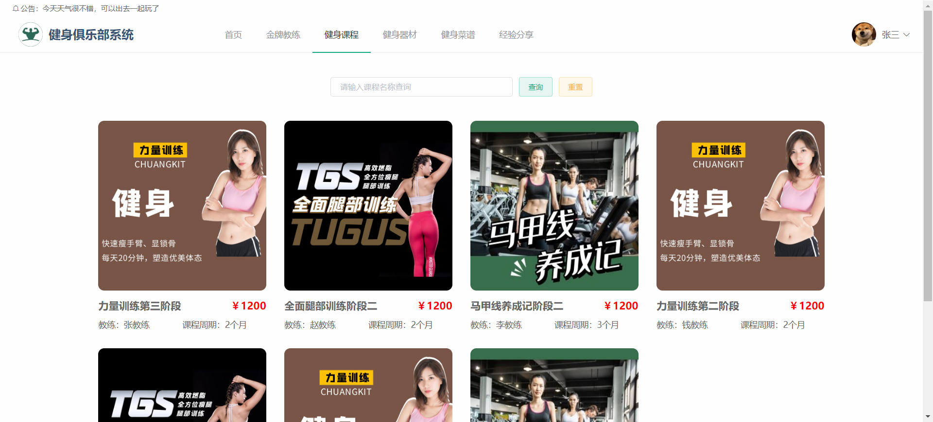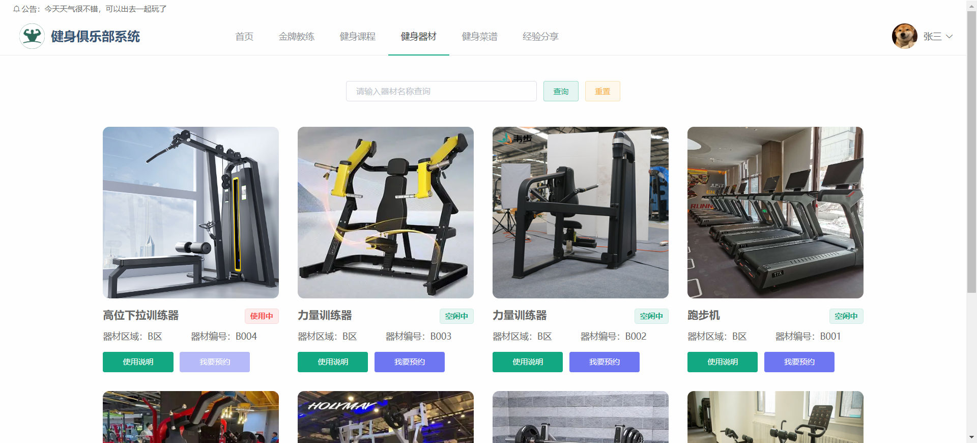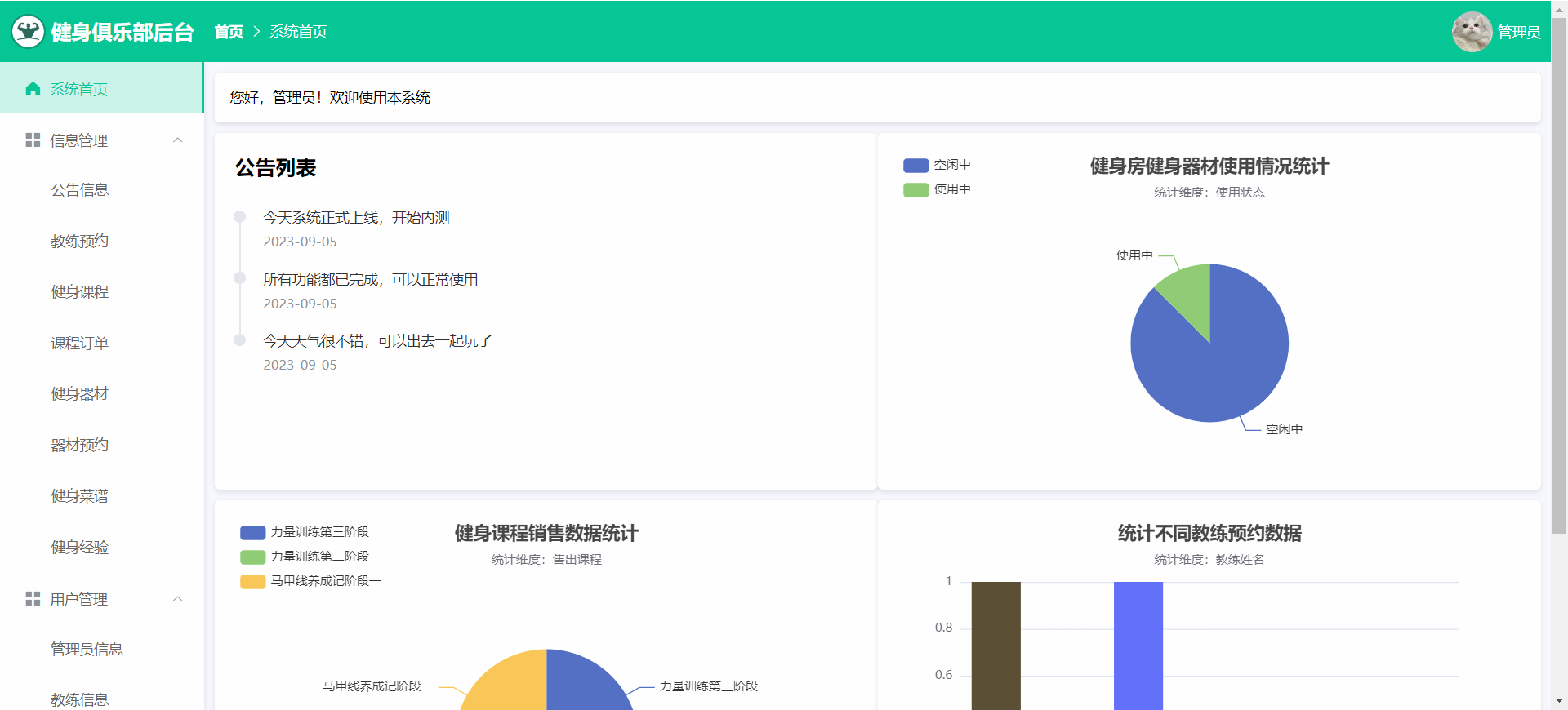 随着健康管理的需求日益增长,传统的健康管理模式已逐渐无法满足现代用户的多元化需求。尤其是在校园或社区环境中,如何高效管理健康数据、预约课程、器材等资源,以及如何为用户提供个性化的健康指导与服务,成为了提升健康管理水平的关键。本项目旨在基于SpringBoot技术架构,设计一套健身管理系统,面向管理员、教练与用户三个不同角色,提供便捷、高效、安全的健康管理平台。系统通过前后端分离的设计模式,确保了操作界面的简洁性与功能的高效性,同时也满足了不同用户的需求。