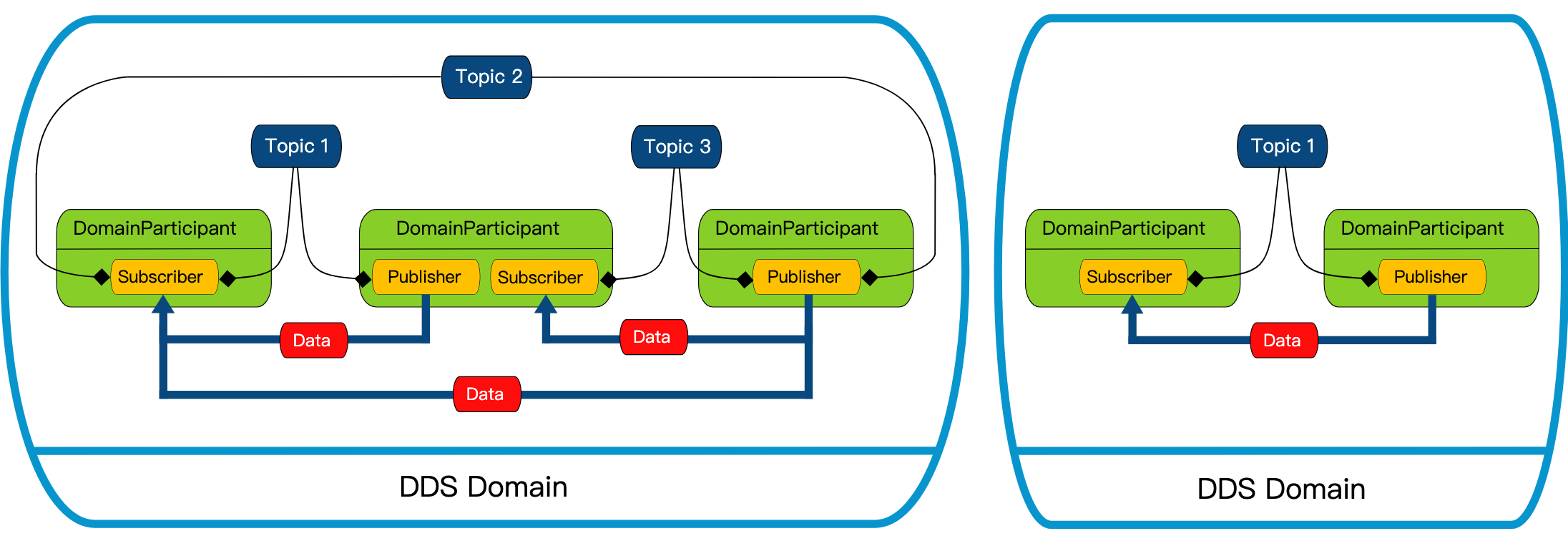 - 可扩展性与灵活性:DDS 基于全局数据空间的概念,中间件负责在发布端与订阅端之间传播信息,这确保了分布式网络能够适应重新配置,并可扩展到大量实体。