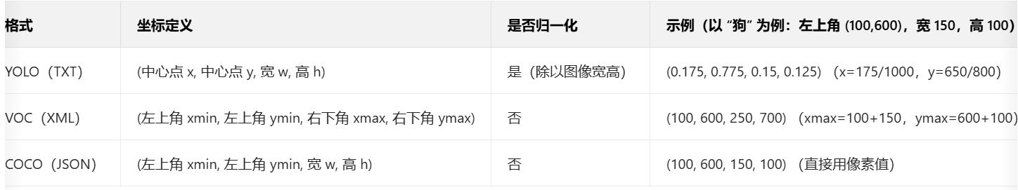 简单记:YOLO 是 “归一化中心点”,VOC 是 “对角坐标”,COCO 是 “像素级左上角 + 宽高”—— 搞懂格式,后续处理数据才不会出错~