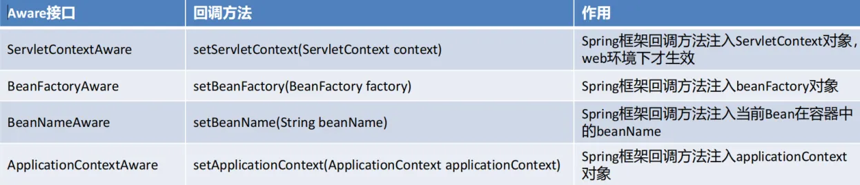 Aware接口是一种框架辅助属性注入的一种思想,其他框架中也可以看到类似的接口。框架具备高度封装性,我们接 触到的一般都是业务代码,一个底层功能API不能轻易的获取到,但是这不意味着永远用不到这些对象,如果用到了 ,就可以使用框架提供的类似Aware的接口,让框架给我们注入该对象 。