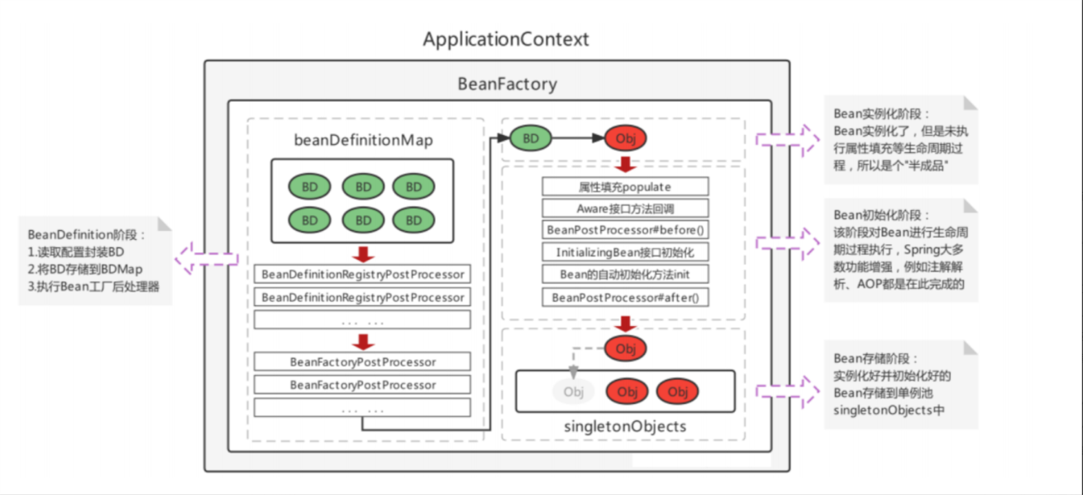 public class DefaultSingletonBeanRegistry ... { //1、最终存储单例Bean成品的容器,即实例化和初始化都完成的Bean,称之为"一级缓存" Map<String, Object> singletonObjects = new ConcurrentHashMap(256); //2、早期Bean单例池,缓存半成品对象,且当前对象已经被其他对象引用了,称之为"二级缓存" Map<String, Object> earlySingletonObjects = new ConcurrentHashMap(16); //3、单例Bean的工厂池,缓存半成品对象,对象未被引用,使用时在通过工厂创建Bean,称之为"三 级缓存" Map<String, ObjectFactory<?>> singletonFactories = new HashMap(16);