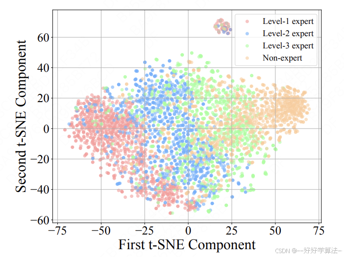 图 3 验证:对 UE^1、UE^2、UE^3 及非专家的用户状态 embedding 做 t-SNE,可见非专家点云散布在 Level-2/3 附近,而非 Level-1,作者据此强调“连续谱”而非二分类。