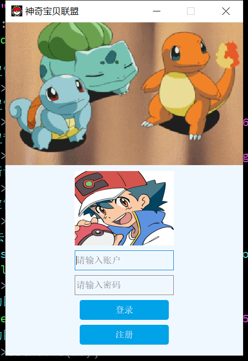 // this->setWindowFlag(Qt::FramelessWindowHint);QLabel *lab1 = new QLabel(this);lab1->resize(480,288);//用动图类 QMovie 实例化一个动图QMovie *mv = new QMovie("C:\\Users\\86158\\Desktop\\QT\\图片素材\\御三家.gif");//将动图放到标签中lab1->setMovie(mv);//让动图动起来mv->start();//自动适应lab1->setScaledContents(true);//创建一个标签 显示图片QLabel *lab2 = new QLabel(this);lab2->move(140,300);lab2->resize(200,150);lab2->setStyleSheet("background-color:blue");//设置图片lab2->setPixmap(QPixmap("C:\\Users\\86158\\Desktop\\QT\\图片素材\\小智.jpg"));//设置自动适应lab2->setScaledContents(true);//创建一个行编辑器QLineEdit *edit1=new QLineEdit;//设置父对象edit1->setParent(this);//设置大小edit1->resize(200,40);//移动edit1->move(140,460);//设置占位符文本edit1->setPlaceholderText("请输入账户");//创建第二个行编辑器QLineEdit *edit2=new QLineEdit(this);//设置大小edit2->resize(200,40);//移动edit2->move(140,510);//设置回显模式edit2->setEchoMode(QLineEdit::Password);//设置占位符文本edit2->setPlaceholderText("请输入密码");//创建一个登录按钮QPushButton *btn1 = new QPushButton("登录",this);btn1->move(150,560);btn1->resize(180,40);//background-color背景颜色 border-radius按钮边框的倒角 color字体颜色 text-align:center 字体居中btn1->setStyleSheet("background-color:rgb(0,162,232);border-radius:5px;color:white;text-align:center;");//创建一个注册按钮QPushButton *btn2 = new QPushButton("注册",this);btn2->move(150,610);btn2->resize(180,40);//background-color背景颜色 border-radius按钮边框的倒角 color字体颜色 text-align:center 字体居中btn2->setStyleSheet("background-color:rgb(0,162,232);border-radius:5px;color:white;text-align:center;");