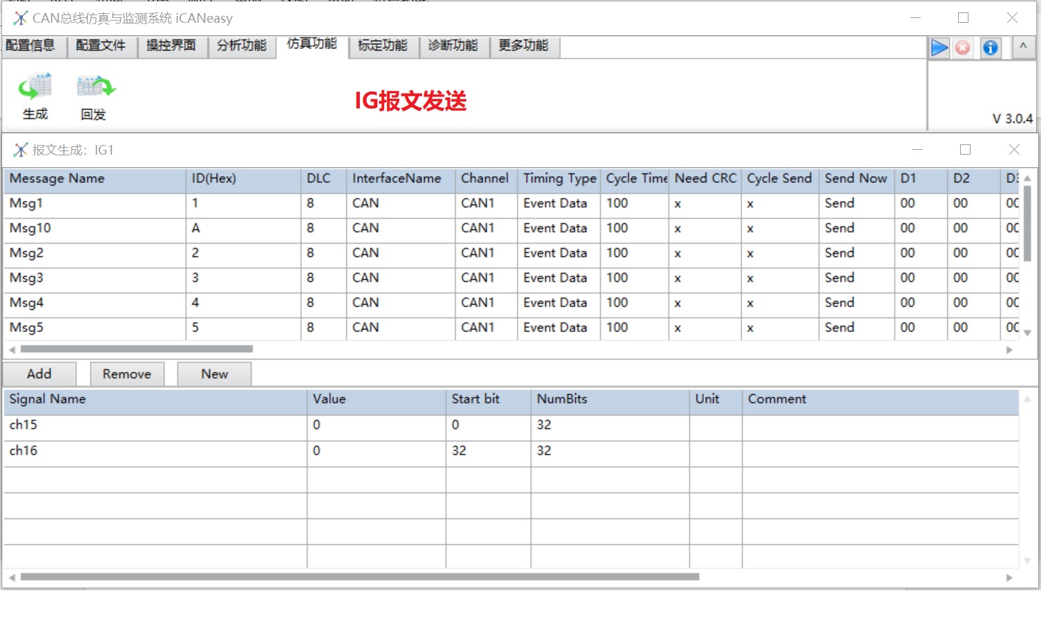 系统软件iCANeasy基于LabVIEW编写,支持灵活的剩余总线仿真配置,可在CAN总线上仿真VCU、MCU、HCU、BCM等整车节点。基于软件实现ECU模型的编写,结合CAN接口卡收发报文,可以实现ECU节点的总线通信仿真,并与BMS(电池管理系统)进行交互,从而满足动力电池的工况测试要求。软件还支持将录制的blf/asc等文件通过CAN端口发送出去,从而将录制的历史环境在实验室中重新生成。软件结合CAN卡与电池包Pack共同形成一个完整的信号级的整车环境,然后在充放电机的协作下使PACK进入各种工况,完成相关测试。