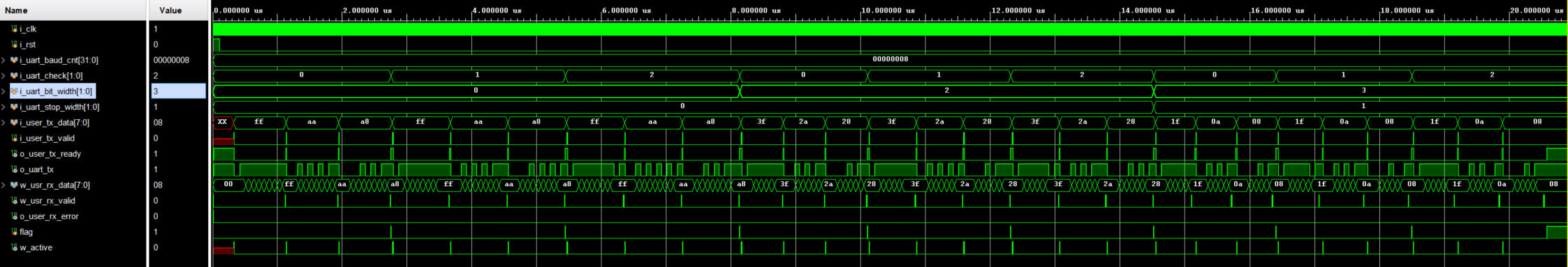 `timescale 1ns / 1ps module tb_UART( ); reg i_clk ; reg i_rst ; reg [31:0] i_uart_baud_cnt ; reg [ 1:0] i_uart_check ; //0-no,1-odd,2-even reg [ 1:0] i_uart_bit_width ; //0-8bit,1-7bit,2-6bit,3-5bit reg [ 1:0] i_uart_stop_width ; //0-1bit,1-1.5bit,2-2bit reg [ 7:0] i_user_tx_data ; reg i_user_tx_valid ; wire o_user_tx_ready ; wire o_uart_tx ; wire [ 7:0] w_usr_rx_data ; wire w_usr_rx_valid ; wire o_user_rx_error ; reg flag ; wire w_active = i_user_tx_valid & o_user_tx_ready ; initial begin i_clk = 0 ; i_rst = 1 ; i_uart_check = 0 ; i_uart_bit_width = 0 ; i_uart_stop_width= 0 ; i_uart_baud_cnt = 8 ; flag = 0 ; #100; @(posedge i_clk) i_rst = 0 ; #200; @(posedge i_clk); send_data(0,0,0); wait(flag); @(posedge i_clk); send_data(1,0,0); wait(flag); @(posedge i_clk); send_data(2,0,0); wait(flag); @(posedge i_clk); send_data(0,2,0); wait(flag); @(posedge i_clk); send_data(1,2,0); wait(flag); @(posedge i_clk); send_data(2,2,0); wait(flag); @(posedge i_clk); send_data(0,3,1); wait(flag); @(posedge i_clk); send_data(1,3,1); wait(flag); @(posedge i_clk); send_data(2,3,1); end always #5 i_clk = ~i_clk ; task send_data(input [3:0] check, input [3:0] bitwidth, input [3:0] stopwidth); begin: send_data_task flag = 0 ; i_uart_check = check ; i_uart_bit_width = bitwidth ; i_uart_stop_width= stopwidth ; @(posedge i_clk); wait(o_user_tx_ready); @(posedge i_clk); case (bitwidth) 0 : begin i_user_tx_data = 8'hFF ; i_user_tx_valid = 1 ; end 1 : begin i_user_tx_data = 8'h7F ; i_user_tx_valid = 1 ; end 2 : begin i_user_tx_data = 8'h3F ; i_user_tx_valid = 1 ; end 3 : begin i_user_tx_data = 8'h1F ; i_user_tx_valid = 1 ; end endcase @(posedge i_clk); case (bitwidth) 0 : begin i_user_tx_data = 8'hFF ; i_user_tx_valid = 0 ; end 1 : begin i_user_tx_data = 8'h7F ; i_user_tx_valid = 0 ; end 2 : begin i_user_tx_data = 8'h3F ; i_user_tx_valid = 0 ; end 3 : begin i_user_tx_data = 8'h1F ; i_user_tx_valid = 0 ; end endcase @(posedge i_clk); wait(o_user_tx_ready); @(posedge i_clk); case (bitwidth) 0 : begin i_user_tx_data = 8'hAA ; i_user_tx_valid = 1 ; end 1 : begin i_user_tx_data = 8'h2A ; i_user_tx_valid = 1 ; end 2 : begin i_user_tx_data = 8'h2A ; i_user_tx_valid = 1 ; end 3 : begin i_user_tx_data = 8'h0A ; i_user_tx_valid = 1 ; end endcase @(posedge i_clk); case (bitwidth) 0 : begin i_user_tx_data = 8'hAA ; i_user_tx_valid = 0 ; end 1 : begin i_user_tx_data = 8'h2A ; i_user_tx_valid = 0 ; end 2 : begin i_user_tx_data = 8'h2A ; i_user_tx_valid = 0 ; end 3 : begin i_user_tx_data = 8'h0A ; i_user_tx_valid = 0 ; end endcase @(posedge i_clk); wait(o_user_tx_ready); @(posedge i_clk); case (bitwidth) 0 : begin i_user_tx_data = 8'hA8 ; i_user_tx_valid = 1 ; end 1 : begin i_user_tx_data = 8'h28 ; i_user_tx_valid = 1 ; end 2 : begin i_user_tx_data = 8'h28 ; i_user_tx_valid = 1 ; end 3 : begin i_user_tx_data = 8'h08 ; i_user_tx_valid = 1 ; end endcase @(posedge i_clk); case (bitwidth) 0 : begin i_user_tx_data = 8'hA8 ; i_user_tx_valid = 0 ; end 1 : begin i_user_tx_data = 8'h28 ; i_user_tx_valid = 0 ; end 2 : begin i_user_tx_data = 8'h28 ; i_user_tx_valid = 0 ; end 3 : begin i_user_tx_data = 8'h08 ; i_user_tx_valid = 0 ; end endcase @(posedge i_clk); wait(o_user_tx_ready); flag = 1 ; end endtask UART_tx u_UART_tx( .i_clk (i_clk ), .i_rst (i_rst ), .i_uart_baud_cnt (i_uart_baud_cnt ), .i_uart_check (i_uart_check ), .i_uart_bit_width (i_uart_bit_width ), .i_uart_stop_width (i_uart_stop_width ), .i_user_tx_data (i_user_tx_data ), .i_user_tx_valid (i_user_tx_valid ), .o_user_tx_ready (o_user_tx_ready ), .o_uart_tx (o_uart_tx ) ); UART_rx UART_rx_u ( .i_clk (i_clk ), .i_rst (i_rst ), .i_uart_rx (o_uart_tx ), .i_uart_baud_cnt (i_uart_baud_cnt), .i_uart_check (i_uart_check ), .i_uart_bit_width (i_uart_bit_width ), .i_uart_stop_width (i_uart_stop_width ), .o_user_rx_data (w_usr_rx_data ), .o_user_rx_valid (w_usr_rx_valid ), .o_user_rx_error (o_user_rx_error) ); endmodule |