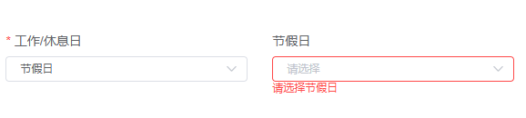 ><el-form-item label="工作/休息日" prop="occur_day_type" class="select"><el-select v-model="disreguInfo.occur_day_type" class="select" @change="isHolidayChange"><el-optionv-for="item in isHolidayOptions":key="item.id":label="item.name":value="item.code"/></el-select></el-form-item><el-form-item label="节假日" prop="occur_holiday" class="select"><el-select v-model="disreguInfo.occur_holiday" :disabled="disreguInfo.occur_day_type !== '1003'" class="select"><el-optionv-for="item in holidayOptions":key="item.id":label="item.name":value="item.code"/></el-select></el-form-item>