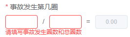 ><el-form-item label="事故发生第几圈" prop="occur_laps" class="select"><el-input v-model="disreguInfo.occur_laps" class="half-ipt" clearable @keyup.native="(disreguInfo.occur_laps = disreguInfo.occur_laps.replace(/[^\d]/g, ''))" /><span style="margin: 0 6px;color: #686868;">/</span><el-input v-model="disreguInfo.total_laps" v-limit class="half-ipt" clearable @keyup.native="(disreguInfo.total_laps = disreguInfo.total_laps.replace(/[^\d]/g, ''))" /><span style="margin: 0 6px;color: #686868;">=</span><el-input v-model="occurLapRate" disabled class="half-ipt" clearable /><span style="margin-left: 6px;color: #686868;">%</span></el-form-item>