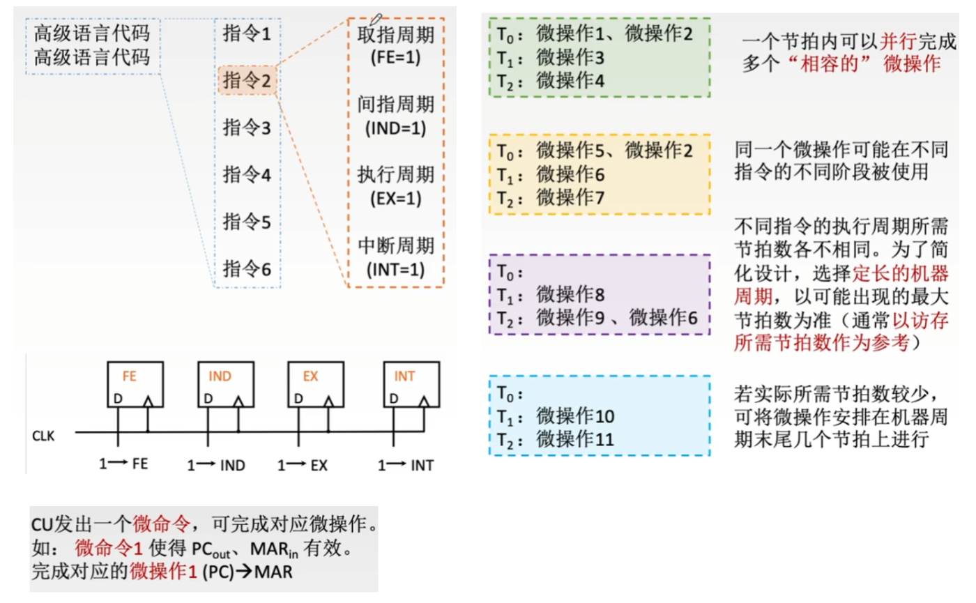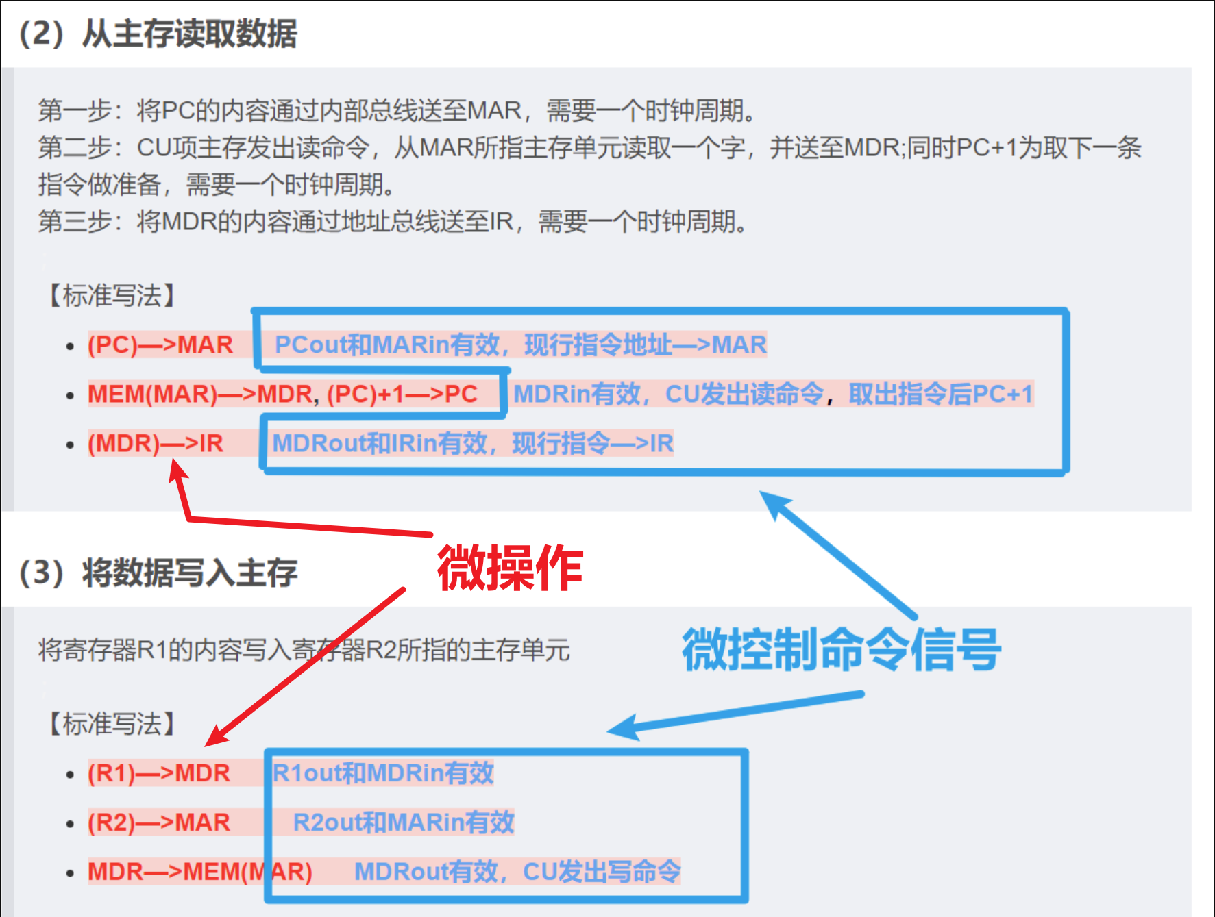 我们前面学的CPU执行指令流程,红色部分的具体流程就是【微操作】,它描述CPU干了什么;蓝色部分是【微命令】,只有这些【微命令生效】的时候,才会操控前面的【微操作】执行成功