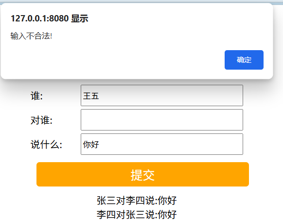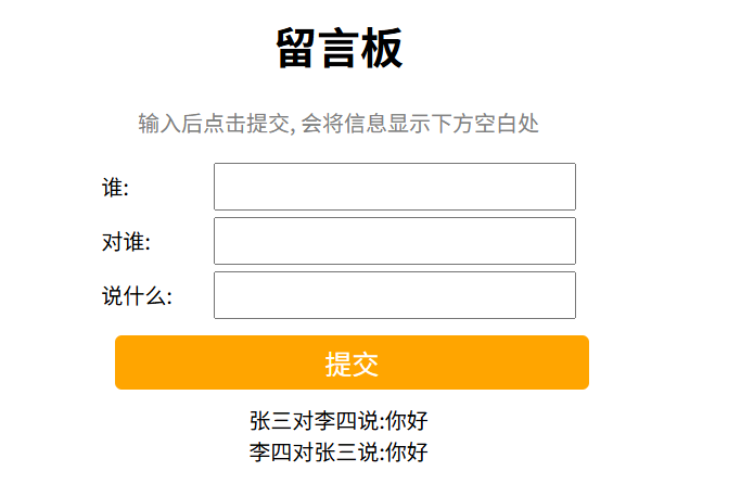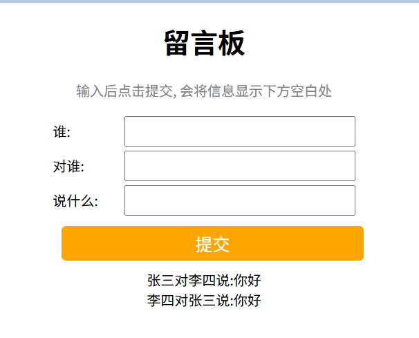 </head><body><div class="container"><h1>留言板</h1><p class="grey">输入后点击提交, 会将信息显示下方空白处</p><div class="row"><span>谁:</span> <input type="text" name="" id="from"></div><div class="row"><span>对谁:</span> <input type="text" name="" id="to"></div><div class="row"><span>说什么:</span> <input type="text" name="" id="message"></div><input type="button" value="提交" id="submit" onclick="submit()"><!-- <div>A 对 B 说: hello</div> --></div><script src="https://cdn.bootcdn.net/ajax/libs/jquery/3.6.4/jquery.min.js"></script><script>$.ajax({url: "/message/getList",type: "get",success: function (messageInfos) {var finalHtml = "";//foreachfor (var messageInfo of messageInfos) {finalHtml += '</div>' + messageInfo.from + '对' + messageInfo.to + '说:' + messageInfo.message + '</div></br>';}$(".container").append(finalHtml);}});function submit() {//1. 获取留言的内容var from = $('#from').val();var to = $('#to').val();var message = $('#message').val();$.ajax({url: "/message/publish",type: "post",data: {//后端:前端变量from: from,to: to,message: message},success: function (result) {if (result) {//2. 构造节点var divE = "<div>" + from + "对" + to + "说:" + message + "</div>";//3. 把节点添加到页面上 $(".container").append(divE);//4. 清空输入框的值$('#from').val("");$('#to').val("");$('#message').val("");}else{alert("输入不合法!");}}});}</script>