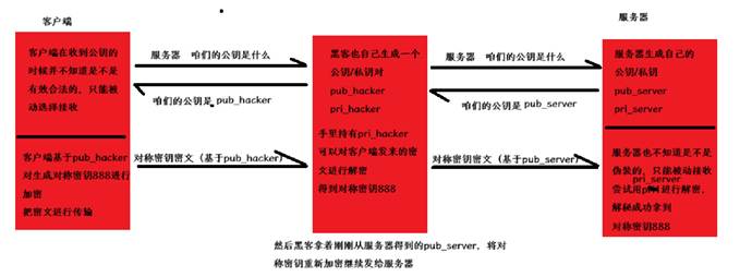 - 最终,服务器将自己的真实公钥(pub_server)发送出去,但黑客可能截获它。