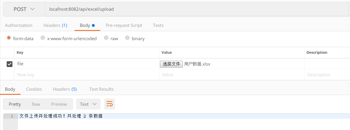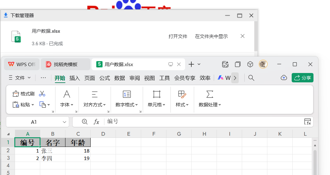 public class ExcelController {/*** Excel导出功能* @param response* @throws IOException* localhost:8082/api/excel/download*/@GetMapping("/download")public void download(HttpServletResponse response) throws IOException {response.setContentType("application/vnd.openxmlformats-officedocument.spreadsheetml.sheet");response.setCharacterEncoding("utf-8");String fileName = URLEncoder.encode("用户数据", "UTF-8");response.setHeader("Content-disposition", "attachment;filename*=utf-8''" + fileName + ".xlsx");// 写入数据FastExcel.write(response.getOutputStream(), User.class).sheet("用户信息").doWrite(buildData());}/*** Excel导出功能* @param file* @return* localhost:8082/api/excel/upload*/@PostMapping("/upload")public ResponseEntity<String> upload(@RequestParam("file") MultipartFile file) {if (file.isEmpty()) {return ResponseEntity.badRequest().body("请选择一个文件上传!");}try {BaseExcelListener<User> baseExcelListener = new BaseExcelListener<>();FastExcel.read(file.getInputStream(), User.class, baseExcelListener).sheet().doRead();// 获取读取的数据List<User> dataList = baseExcelListener.getDataList();System.out.println("读取到的数据: " + dataList);return ResponseEntity.ok("文件上传并处理成功!共处理 " + dataList.size() + " 条数据");} catch (IOException e) {return ResponseEntity.status(500).body("文件处理失败: " + e.getMessage());}}// 创建测试数据private List<User> buildData() {User user1 = new User();user1.setId(1);user1.setName("张三");user1.setAge(18);User user2 = new User();user2.setId(2);user2.setName("李四");user2.setAge(19);return List.of(user1, user2);}