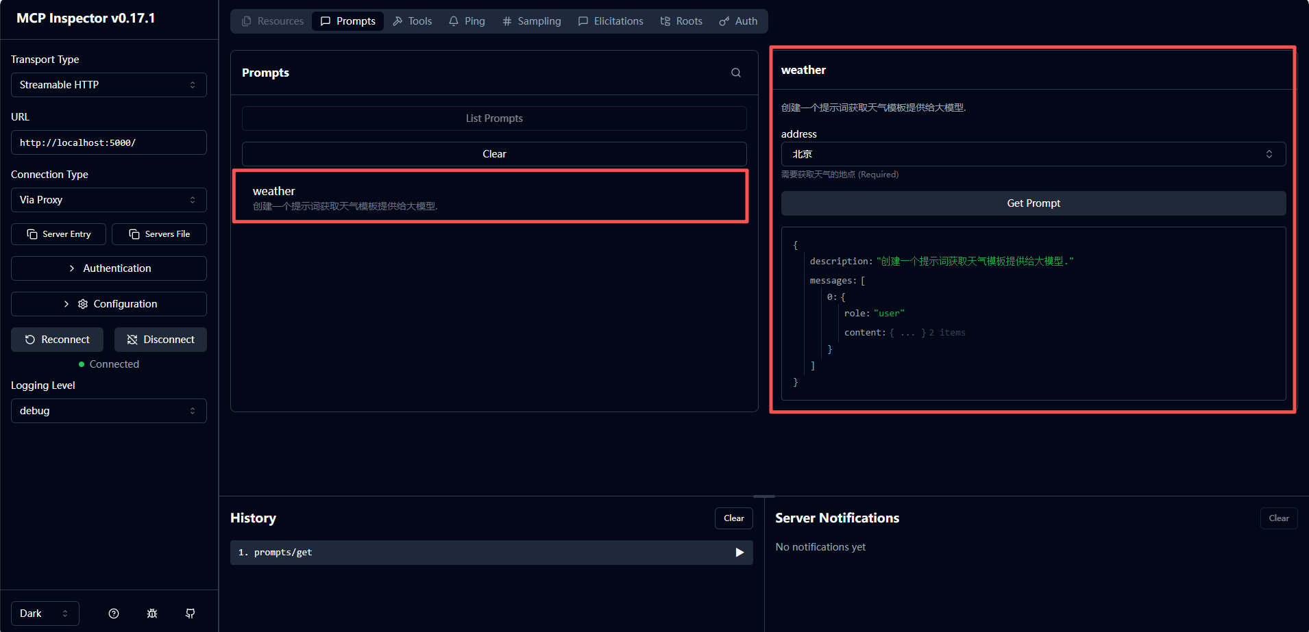 {[McpServerPrompt, Description("创建一个提示词获取天气模板提供给大模型.")]public static ChatMessage Weather([Description("需要获取天气的地点")] string address) =>new(ChatRole.User, $"获取:{address}当前天气");