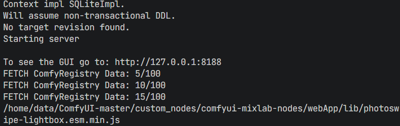 出现下面这个ip地址代码成功,使用浏览器访问这个ip即可。确保每次打开之前8188端口没有被占用,如果占用的话,需要杀死占用线程或者切换运行端口号。