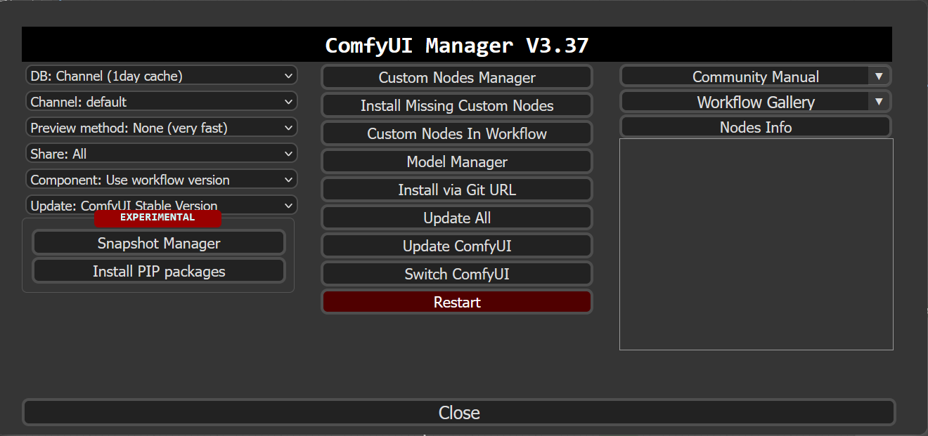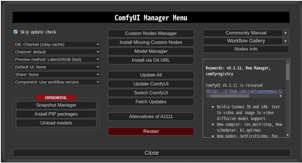 ComfyUI-Manager 是一个旨在增强 ComfyUI 可用性的扩展。它提供了安装、删除、禁用和启用 ComfyUI 的各种自定义节点的管理功能。此外,此扩展还提供了集线器和便利功能,以访问 ComfyUI 中的各种信息。