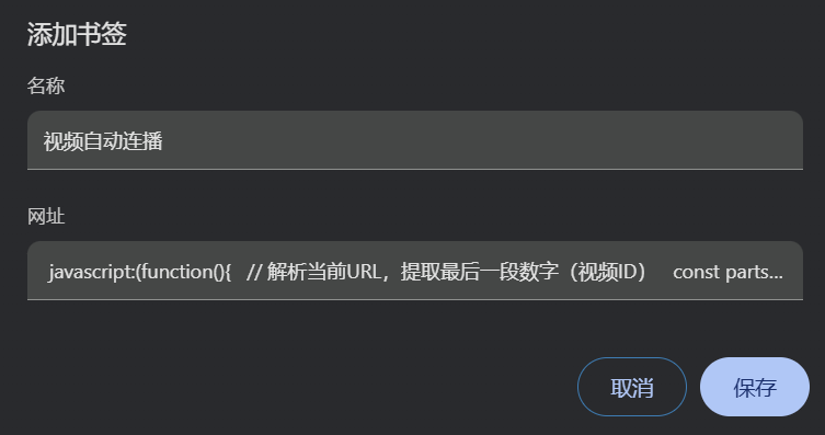 javascript:(function(){// 解析当前URL,提取最后一段数字(视频ID)const parts = window.location.href.split('/');const lastPart = parts[parts.length - 1];const currentId = parseInt(lastPart);if (!isNaN(currentId)) {// 计算下一个视频ID(根据实际规律调整,这里假设+1)const nextId = currentId + 1;// 替换URL中的ID并跳转parts[parts.length - 1] = nextId;const nextUrl = parts.join('/');// 延迟3秒跳转(预留视频结束缓冲时间,可调整)setTimeout(() => window.location.href = nextUrl, 3000);} else {alert('未识别到视频序号参数');}
