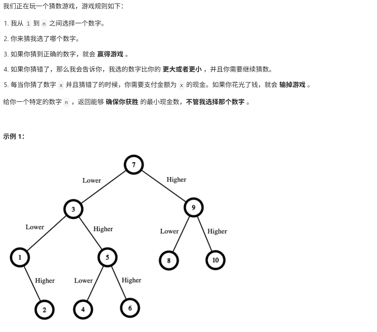 public:int getMoneyAmount(int n) {return dfs(1,n);}int dfs(int left,int right){//递归出口if(left>=right) return 0;int ret=INT_MAX;for(int head=left;head<=right;head++){int l=dfs(left,head-1);int r=dfs(head+1,right);ret=min(ret,max(l,r)+head);}return ret;}