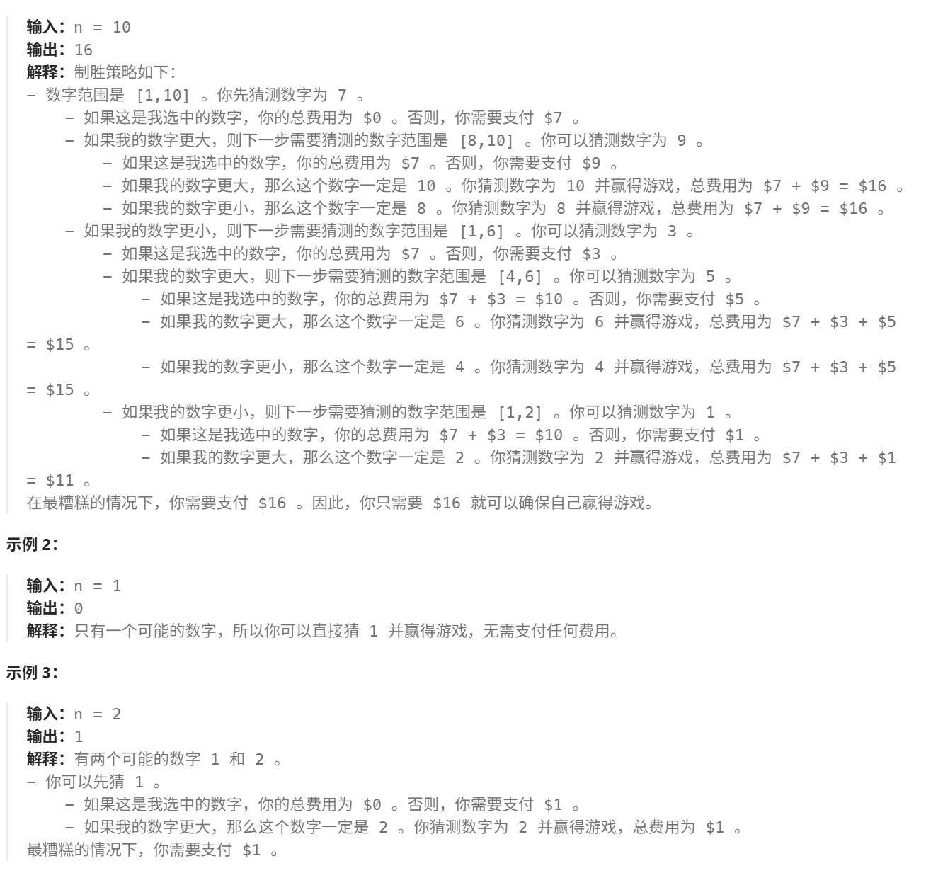 public:int getMoneyAmount(int n) {return dfs(1,n);}int dfs(int left,int right){//递归出口if(left>=right) return 0;if(memo[left][right]!=0) return memo[left][right];int ret=INT_MAX;for(int head=left;head<=right;head++){int l=dfs(left,head-1);int r=dfs(head+1,right);ret=min(ret,max(l,r)+head);}memo[left][right]=ret;return ret;}